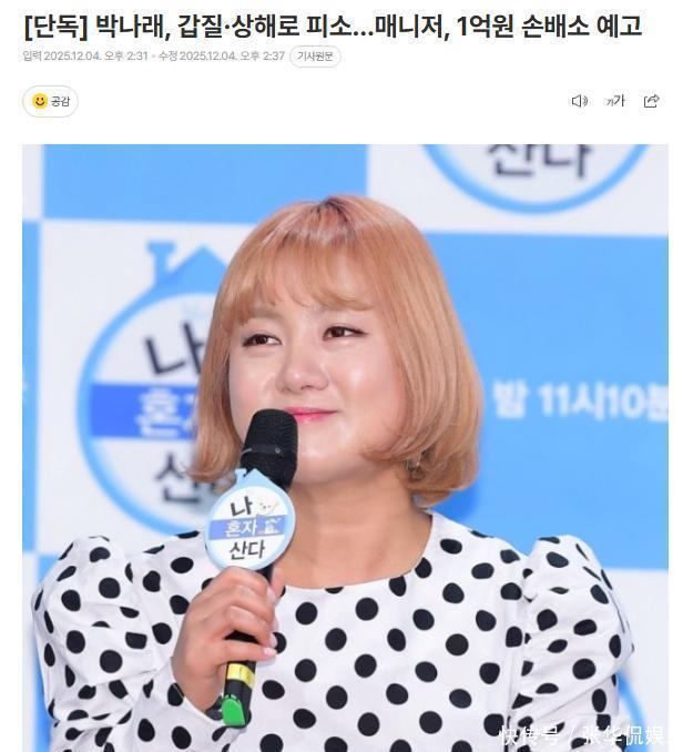 这要是真的,她的形象可就彻底翻车了!今日,韩国著名狗仔媒体Dispatch发文爆料韩国著名搞笑艺人朴娜莱被经纪人申请财产保全。本月3日,朴娜莱的前经纪人们向首尔西部地方法院提交了不动产保全申请。随后,他们声称在工作期间遭受了来自朴娜莱的伤害,预告将提起金额约1亿韩元的损害赔偿诉讼。